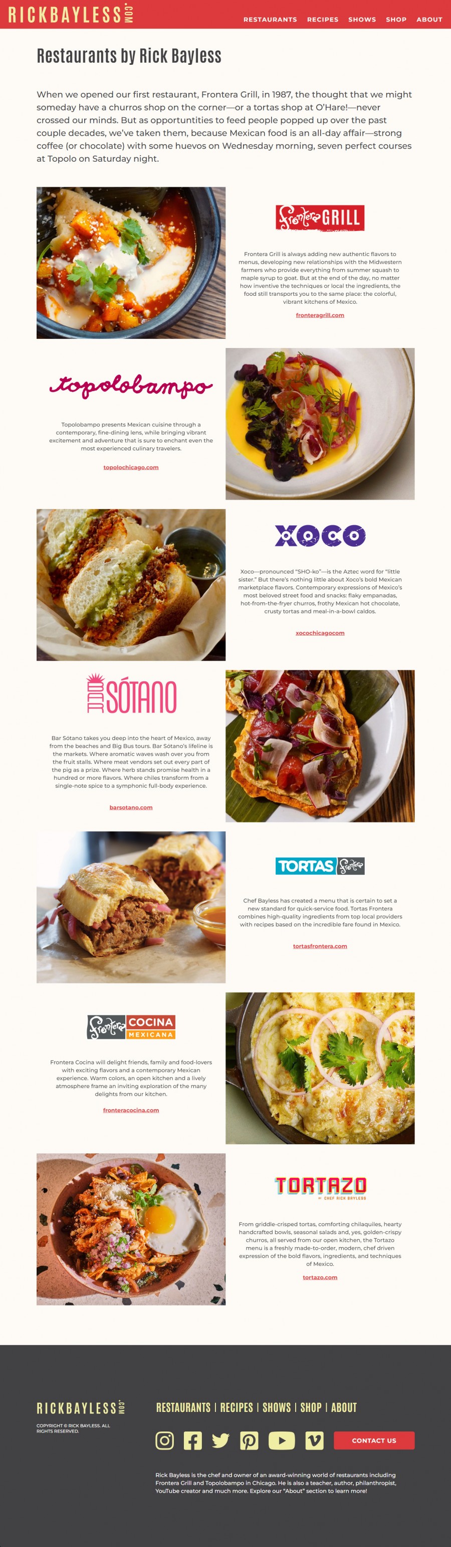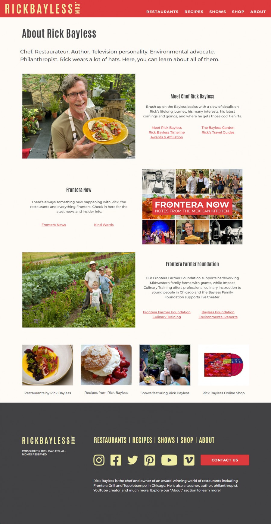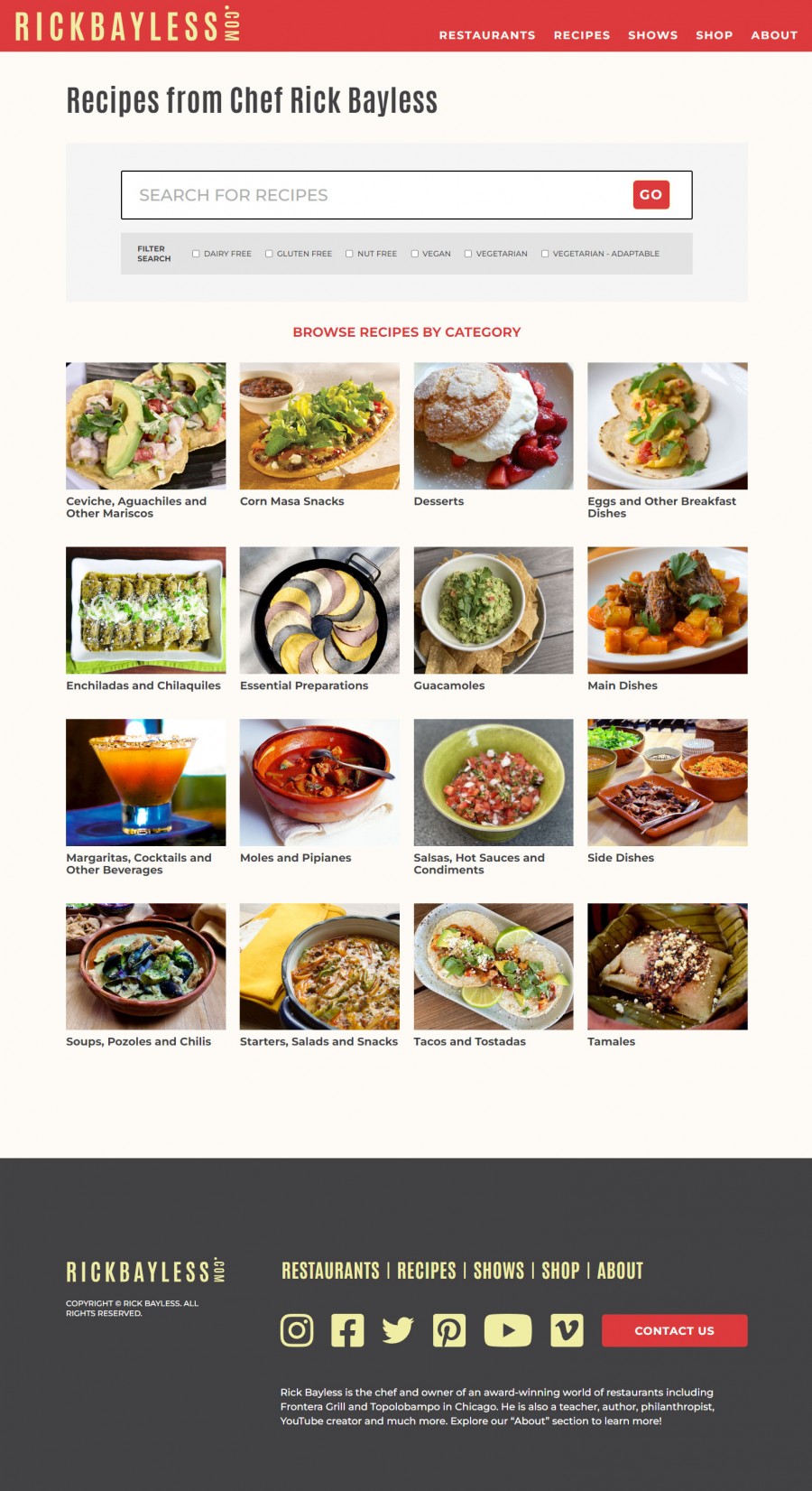 Michael Carr designed this fantastic site, and Rodman Design brought it to life! This is the third version we’ve built for Rick Bayless, and it continues to evolve with fresh features. The recipe section is a standout, offering a rich collection of authentic Mexican dishes that make the site a true culinary hub.